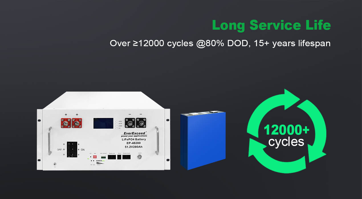خلايا LiFePO4 من الدرجة الأولى مع ≥12000 دورة وعمر افتراضي 15 عامًا، مزودة بمطفأة حريق مدمجة، معتمدة وصديقة للبيئة.