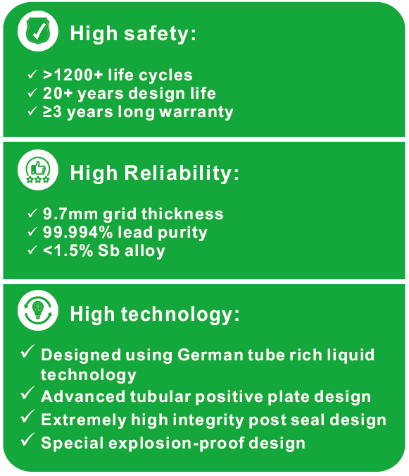 | تكنولوجيا | بطارية الرصاص الحمضية الأنبوبية + العاكس + وحدة الطاقة الكهروضوئية |