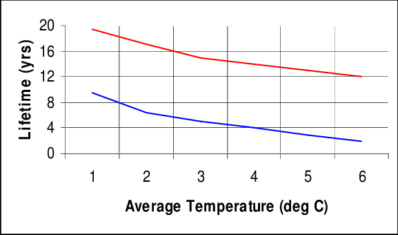 دعنا نلقي نظرة على عدد قليل من هذه العوامل ونسلط الضوء على التأثير الذي قد يؤثر على عمر الخدمة. من المسلم به أن درجة الحرارة تلعب دورًا رئيسيًا في إطالة عمر الخدمة أو تقليله. ومع ذلك ، من المهم ملاحظة أن تأثير درجة الحرارة ليس خطيًا. تكون درجات الحرارة المتزايدة على خلية البطارية أكثر شدة في تقصير عمر الخدمة مقارنة بدرجات الحرارة الباردة التي تطيلها. من المقبول عمومًا أنه مقابل كل 10 ° C ارتفاع في درجة الحرارة يتم تطبيقه باستمرار على البطارية ، فإن النتيجة هي انخفاض في عمر البطارية بنسبة 50٪ تقريبًا (انظر الشكل أدناه).