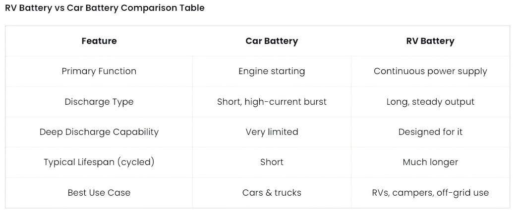 In short, is an RV battery the same as a car battery? No, and selecting the correct one makes daily RV life far more reliable and predictable.