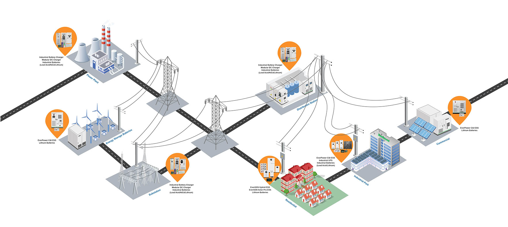 توفر شركة EverExceed أنظمة التيار المستمر القابلة للتطوير، وأجهزة الشحن الصناعية، وتخزين الطاقة لدعم المحطات الفرعية، ومحطات التبديل، وعقد نقل الجهد العالي/المتوسط.